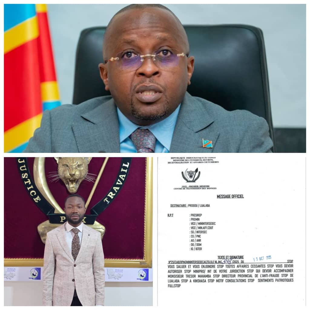 Kolwezi,18 Octobre 2025(TOP243NEWS).-La République démocratique du Congo ne peut prétendre à un État de droit si les règles administratives les plus élémentaires sont foulées aux pieds, même par les plus hautes autorités. C’est à ce titre que la convocation à Kinshasa de Trésor Mahamba, directeur provincial de la lutte contre la fraude dans le Lualaba, soulève de vives interrogations juridiques et institutionnelles.