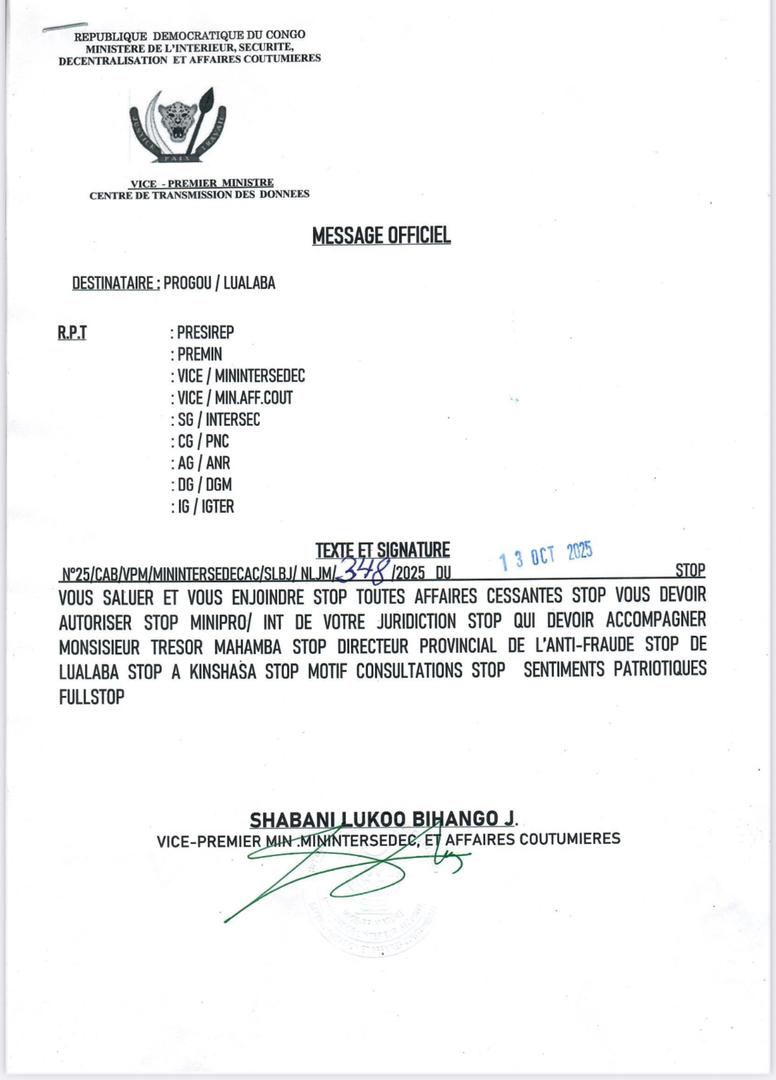 Kolwezi,18 Octobre 2025(TOP243NEWS).-La République démocratique du Congo ne peut prétendre à un État de droit si les règles administratives les plus élémentaires sont foulées aux pieds, même par les plus hautes autorités. C’est à ce titre que la convocation à Kinshasa de Trésor Mahamba, directeur provincial de la lutte contre la fraude dans le Lualaba, soulève de vives interrogations juridiques et institutionnelles.