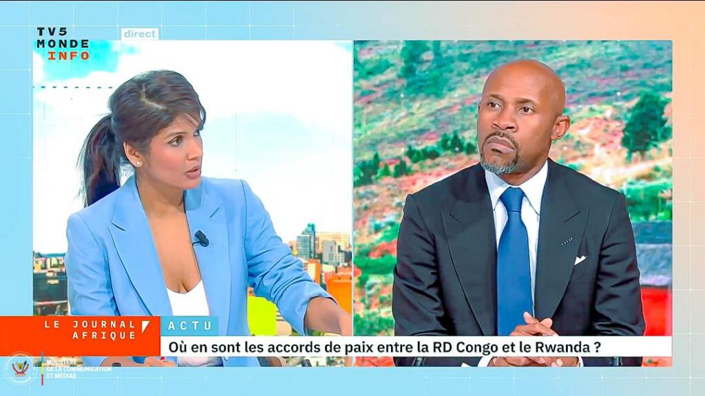 Paris, 11 Novembre 2025 ( TOP243NEWS ). — Invité du Journal Afrique sur TV5Monde, le ministre de la Communication et Médias et porte-parole du gouvernement, Patrick Muyaya, est revenu sur plusieurs sujets d’actualité brûlante : la situation sécuritaire dans l’Est de la République Démocratique du Congo, le procès de Roger Lumbala à Paris, ainsi que les avancées diplomatiques de Kinshasa à Washington et Doha.