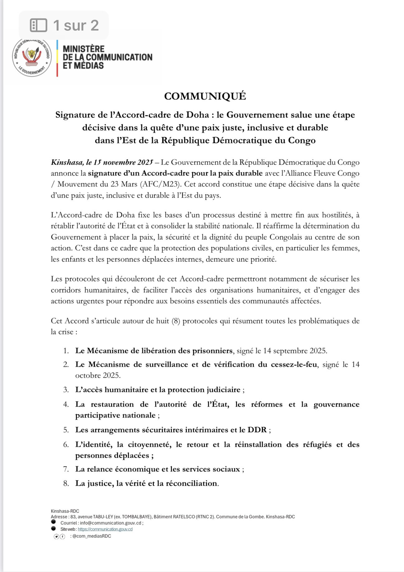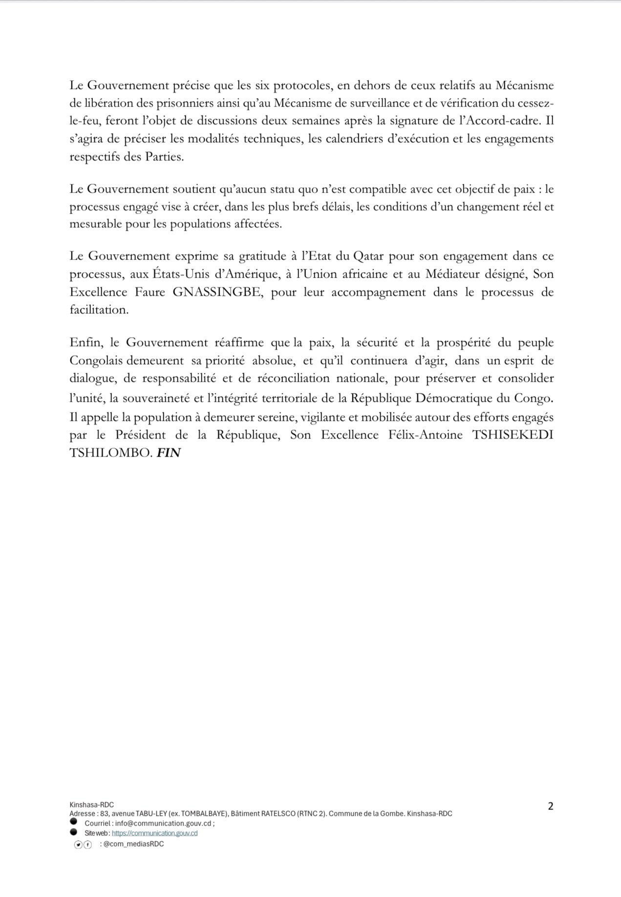 Selon le gouvernement congolais, cet engagement représente une étape cruciale dans le processus qui doit aboutir à un accord de paix définitif, attendu depuis plusieurs années par les populations de l’Est.