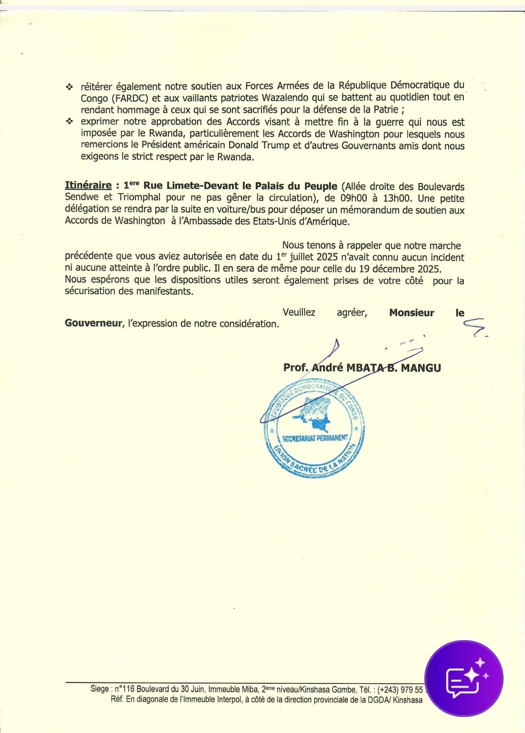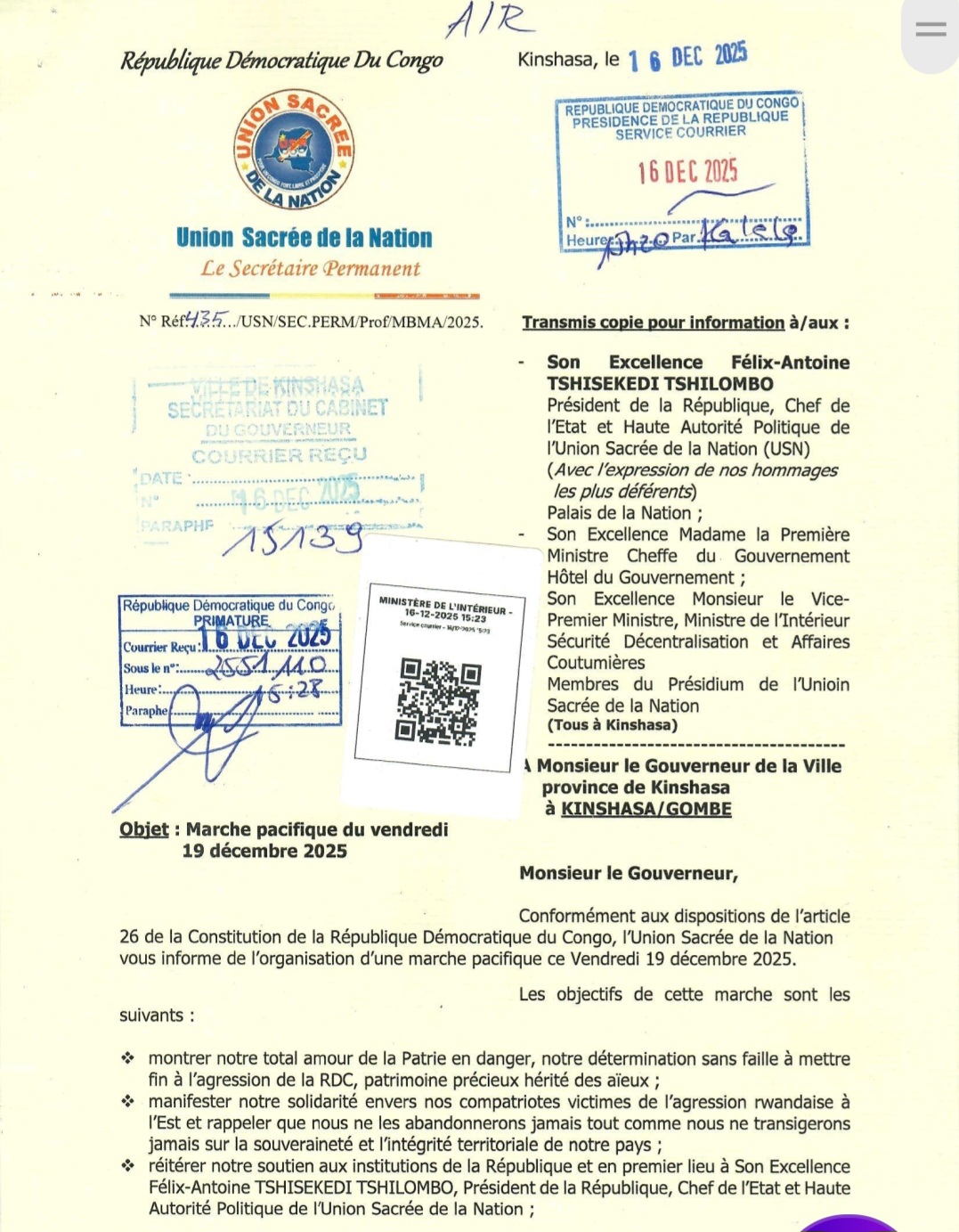 L’Union sacrée de la Nation (USN) a officiellement notifié les autorités provinciales de la ville de Kinshasa de l’organisation d’une marche pacifique prévue pour le vendredi 19 décembre 2025, conformément aux dispositions de l’article 26 de la Constitution de la République démocratique du Congo.