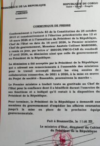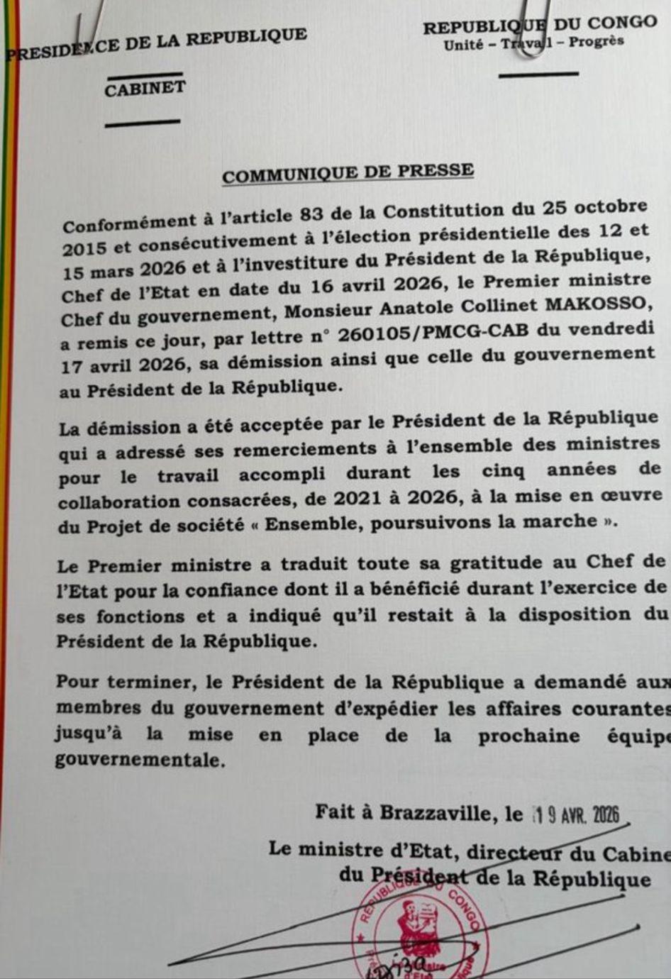 Brazzaville, 21 avril 2026 ( TOP243NEWS ).-Le Premier ministre, Anatole Collinet Makosso, a officiellement présenté sa démission ainsi que celle de l’ensemble de son gouvernement au Président de la République, Denis Sassou N’Guesso le samedi dernier , conformément aux dispositions constitutionnelles en vigueur ouvrant ainsi une nouvelle étape politique.